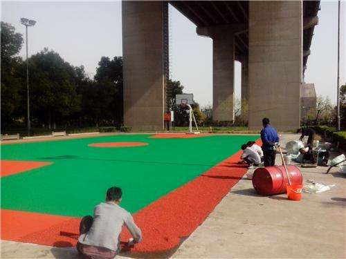 ⑴聚氨酯塑膠材料的施工過程中最怕水、膠漿 在初步固化前碰到一滴水珠就會產生一個大的氣泡,因此施工人員在高溫條件下作業要準備毛巾擦汗。鋪膠面時一定掌握天氣情況并要做好防止突降陣雨的應急措施。鋪膠時間要避開早晨大氣中和地面濕度較大的時候,即使在天氣晴朗的正常工作日,一般最好在上午九點以后正式鋪設, 塑膠跑道鋪設。⑵膠面的實鋪厚度是指從膠底至表層膠粒的中心,一般從兩方面控制。首先通過立模進行厚度尺寸的預檢,對基層局部高出的地方進行修砍或錘擊進行夯低。如果高出不多,可采用平刮尺上加卡具離模刮漿來保證厚度,第11屆亞運會北郊比賽場塑膠跑道主賽區為保證厚度,誤差控制為正差,故平均厚度在14MM以上。⑷防止膠面鋪筑后局部發生起泡 脫殼,對于基層密實度要嚴格控制,防止瀝青基礎層自身嵌擠不實,脫殼脫層,致使粘結力差,表面氣化,膠面被拉斷。基層密實度不夠的地方,可以采用鉆頭打孔,灌膠(橡膠釘)的方法進行加固。⑸為保證平整度、坡度,模條釘好后,用水平儀進行模擬校正,基層個別高的地方,先加以整平,個別低的地方,用膠填平。⑹被柴油污染和腐蝕的基礎部位堅決挖掉,用膠填平。